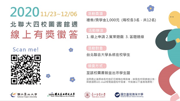 活動獎項 禮券/獎學金1000元(每校名額3名,共12名)。 領獎方式 活動截止後將由各校自訂日期抽出得獎者,詳見各校圖書館公告。圖書館將以E-mail或電話通知中獎者,中獎者以不重覆為原則。 領獎時請出示學生證至該校圖書館領獎。 活動說明 開始做答 活動獎項