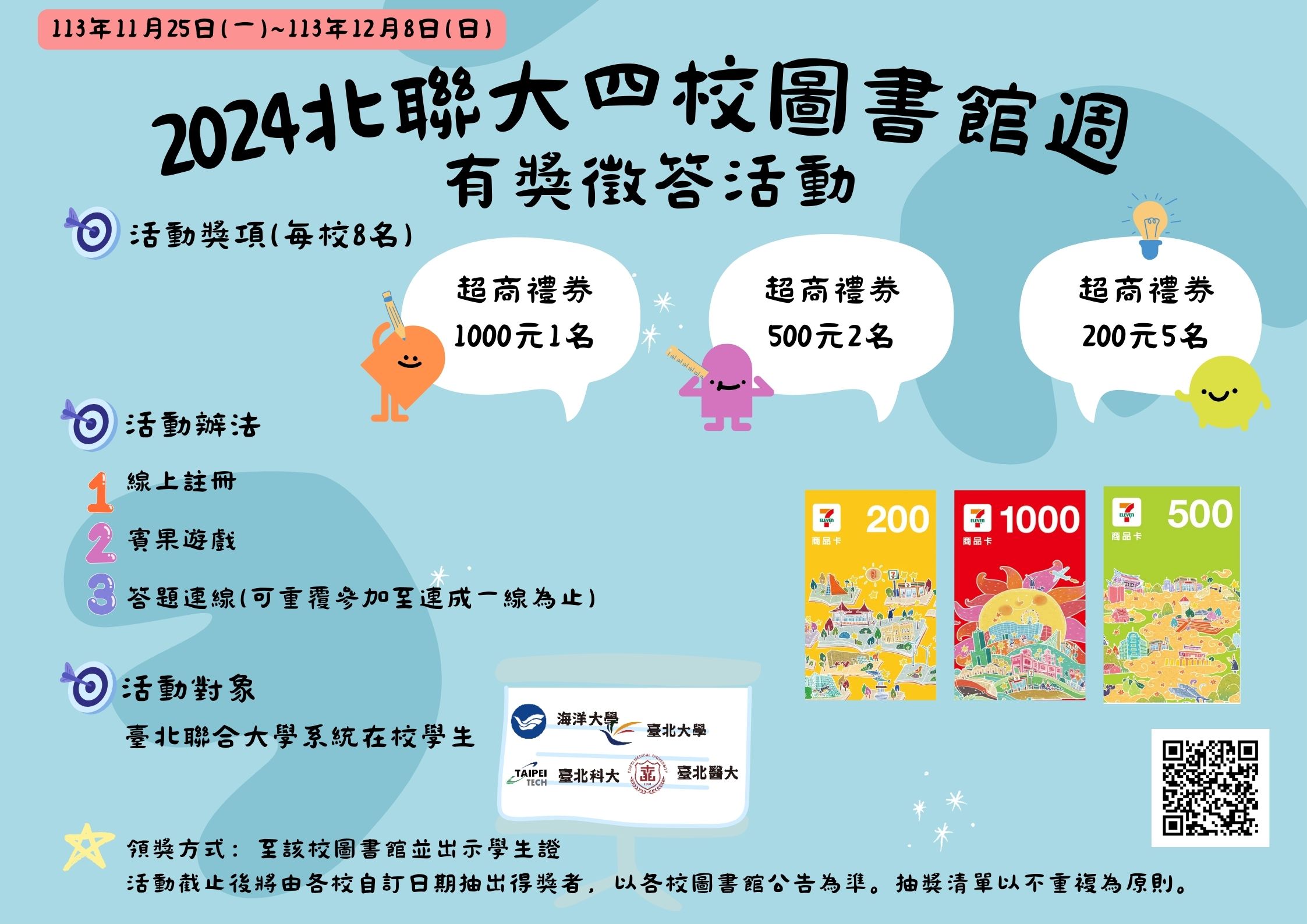 活動獎項 每個學校分別有8個名額:1000元禮券一名、500元禮券二名、200元禮券五名。 抽獎名單以不重覆為原則。舉例說明:A同學全部答對,先抽1000元奬項,前項沒抽中者仍具備抽500元奬項及200元奬項資格。以此類推。 領獎方式 活動截止後將由各校自訂日期抽奬。得獎者以E-mail或電話通知,詳見各校圖書館公告。 領獎時請出示學生證至該校圖書館領獎。 活動說明 開始做答 活動獎項