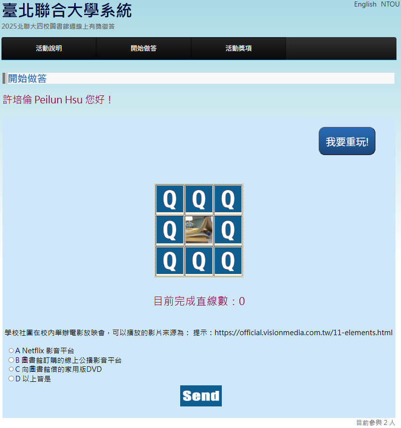 - 連成8條直線者(全部答對),有資格抽1000元禮券。