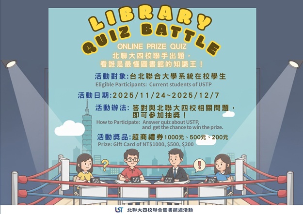 活動獎項 每個學校分別有8個名額:1000元禮券一名、500元禮券二名、200元禮券五名。 抽獎名單以不重覆為原則。舉例說明:A同學全部答對,先抽1000元奬項,前項沒抽中者仍具備抽500元奬項及200元奬項資格。以此類推。 領獎方式 活動截止後將由各校自訂日期抽奬。得獎者以E-mail或電話通知,詳見各校圖書館公告。 領獎時請出示學生證至該校圖書館領獎。 活動說明 開始做答 活動獎項